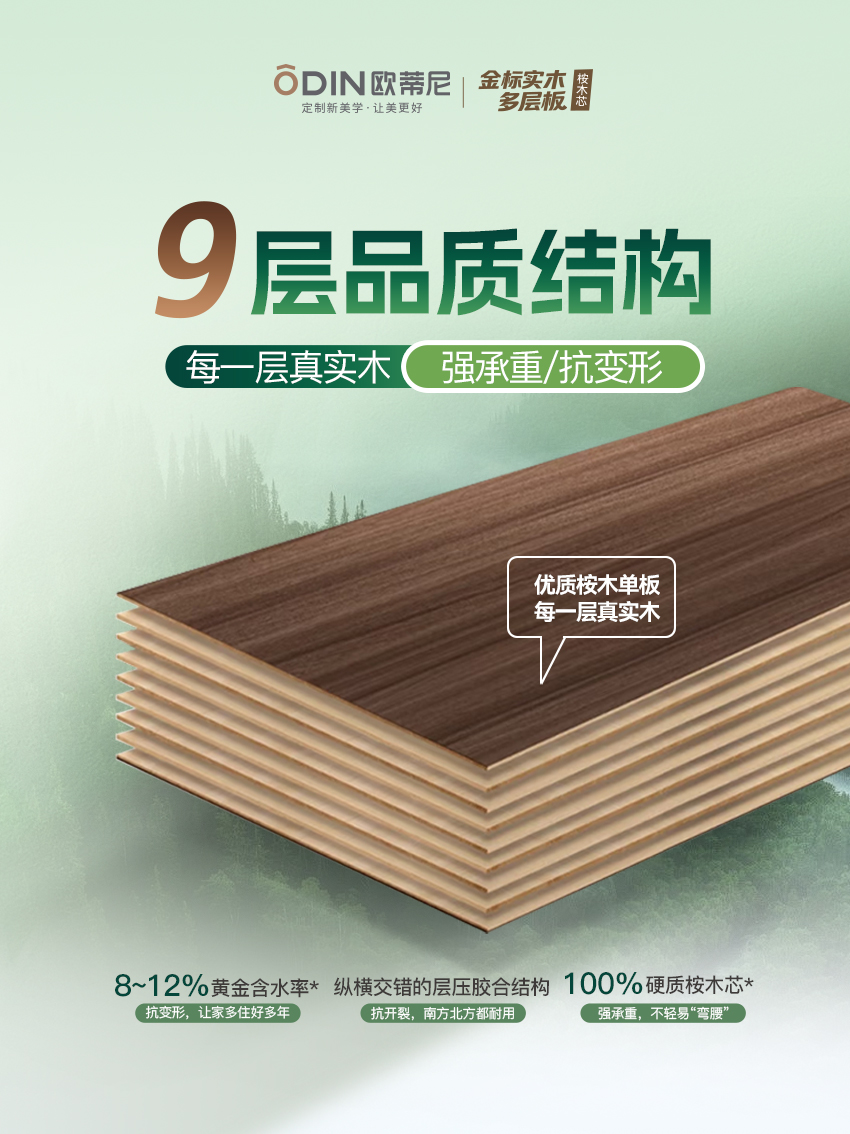 ODIN欧蒂尼金标实木多层板,以卓越品质重新定义行业标准。精选10年以上优质桉木,采用9层纵横交错层压胶合工艺,打造兼具强度与美学的新一代环保板材,为高端定制家居提供完美解决方案。