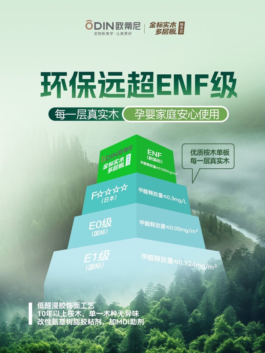 ODIN欧蒂尼金标实木多层板,以卓越品质重新定义行业标准。精选10年以上优质桉木,采用9层纵横交错层压胶合工艺,打造兼具强度与美学的新一代环保板材,为高端定制家居提供完美解决方案。