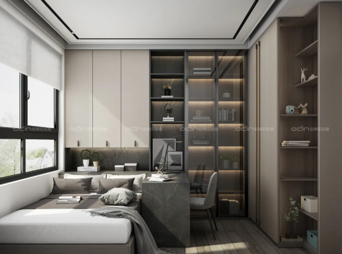 单色门板结合木纹箱体,再铺以石纹及玻门点缀,整洁而大方。功能房是可以集书房、休闲房、次卧等功能于一身的房间,能够满足我们多种需求。书房兼具卧室的个性化定制设计,赋予更高效、更灵活多变的空间使用性。